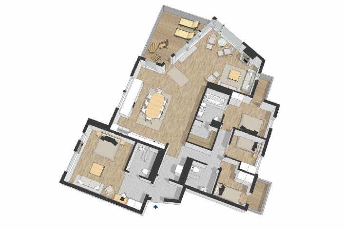 Appartement op de zesde verdieping, 8+2 bedden, 148 m², woonkamer met gecombineerde keuken, 4 slaapkamers, 3 douches, 3 WC, 1 sauna.