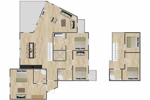 Slaapkamers:Slaapkamer 1= 1 tweepersoonsbed 180 cm breed. Slaapkamer 2= 1 tweepersoonsbed 180 cm breed. Slaapkamer 3= 1 tweepersoonsbed. Slaapkamer 4= 2 eenpersoonsbedden. Slaapkamer 5= 1 tweepersoonsbed 180 cm breed, slaapbank.