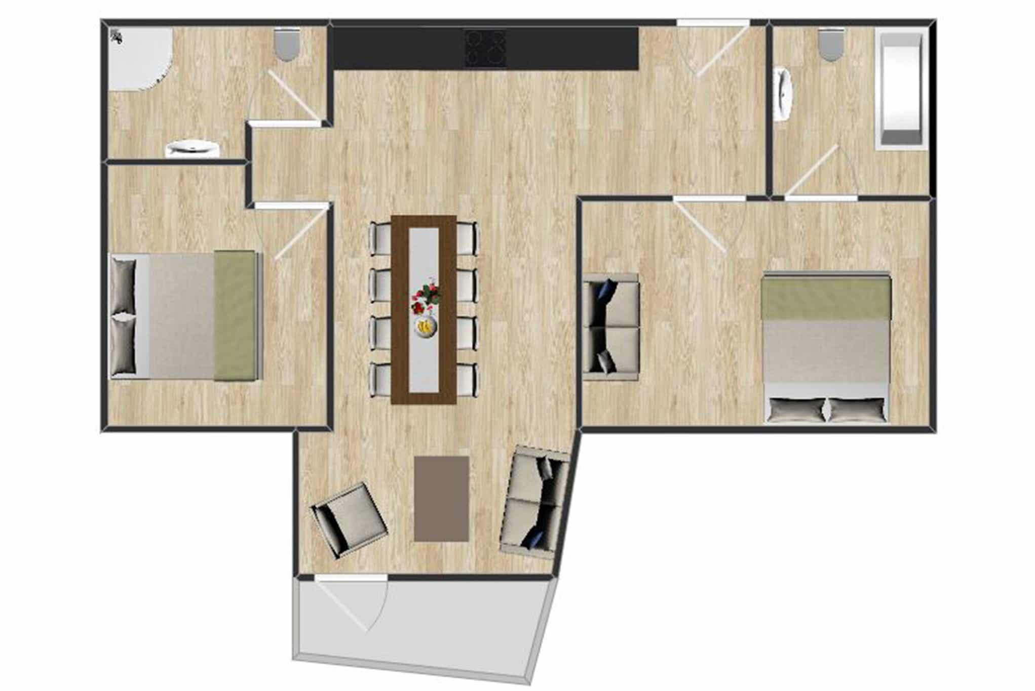 Appartement op de zevende verdieping, 4+2 bedden, 75 m², woonkamer met gecombineerde keuken, 2 slaapkamers, 2 douches, 2 WC.