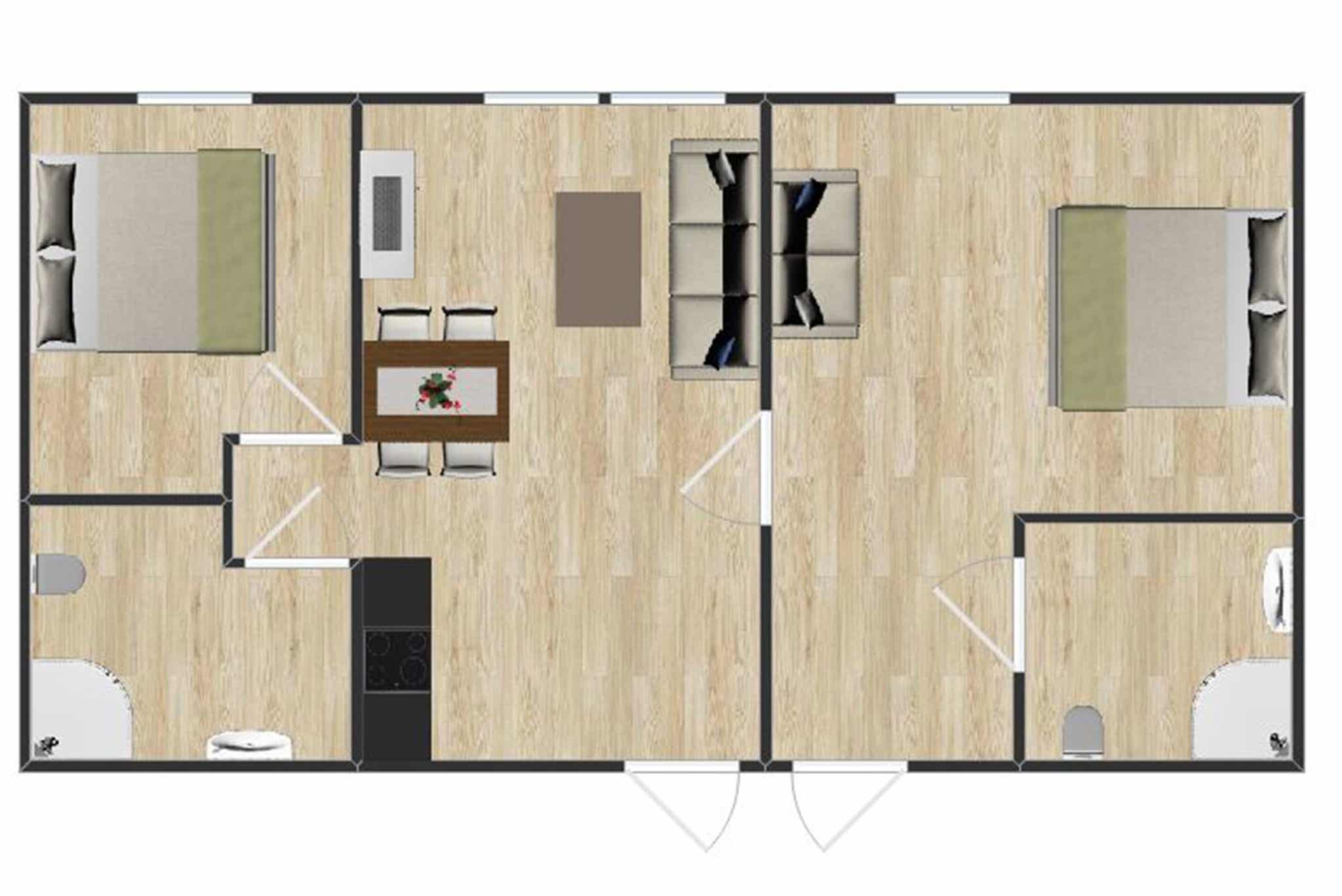 Appartement op de zevende verdieping, 4+2 bedden, 67 m², woonkamer met gecombineerde keuken, 2 slaapkamers, 2 douches, 2 WC.