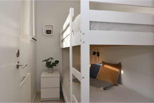 Slaapkamers:Slaapkamer 1 = 1 tweepersoonsbed dat kan worden opgedeeld in twee eenpersoonsbedden. Slaapkamer 2 = 1 stapelbed.