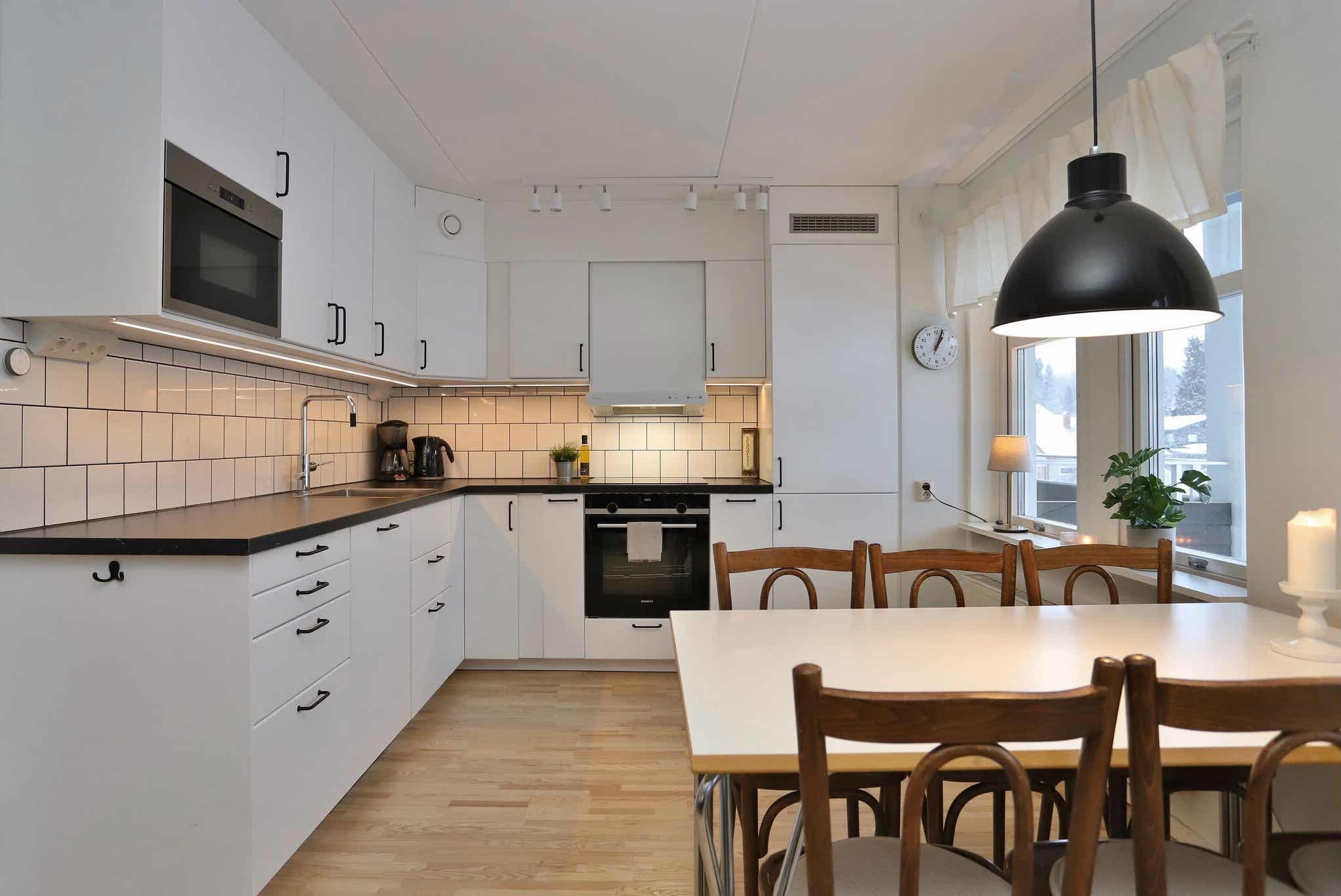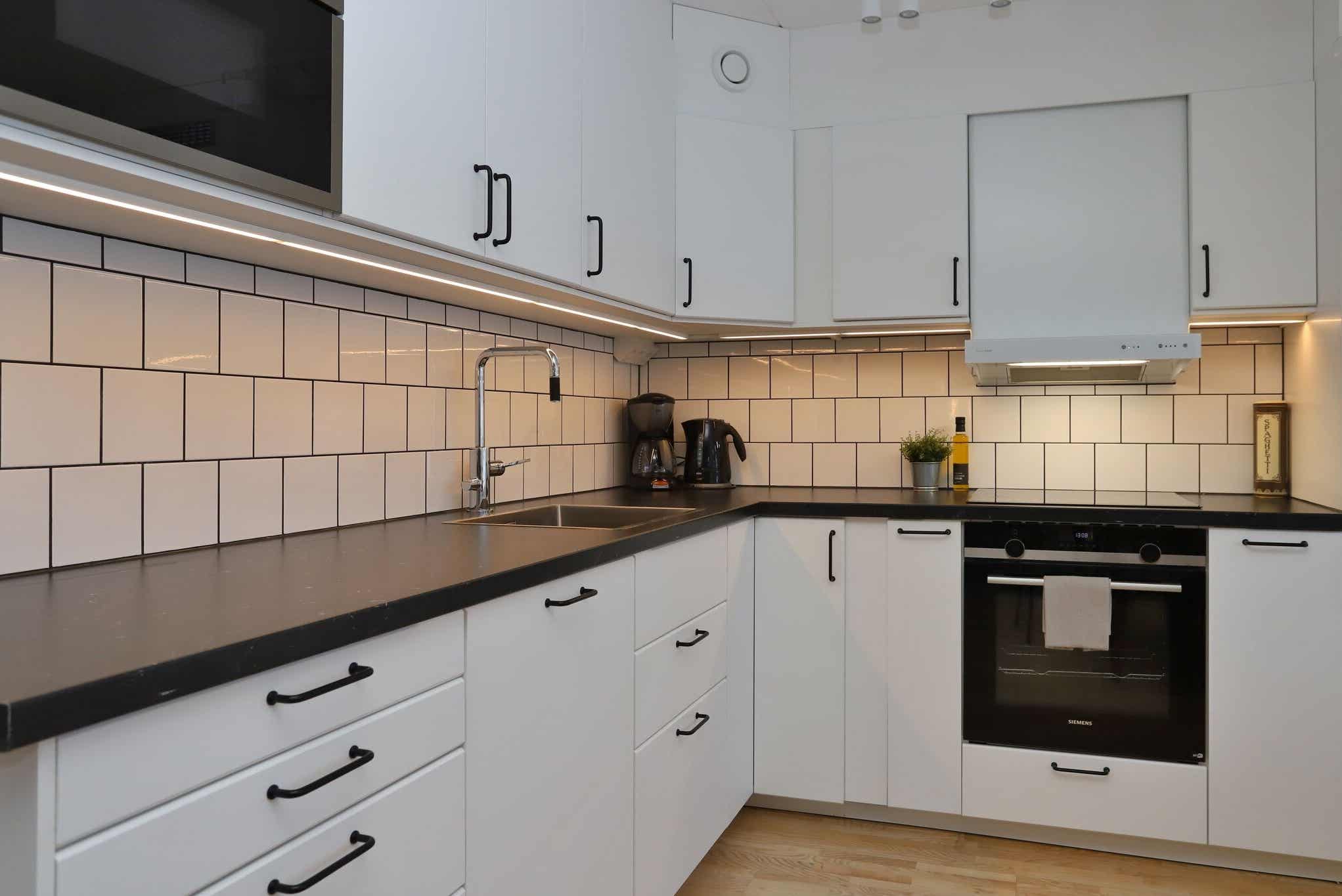 Keuken bevat fornuis met oven, koelkast en vriezer, vaatwasser, magnetron.