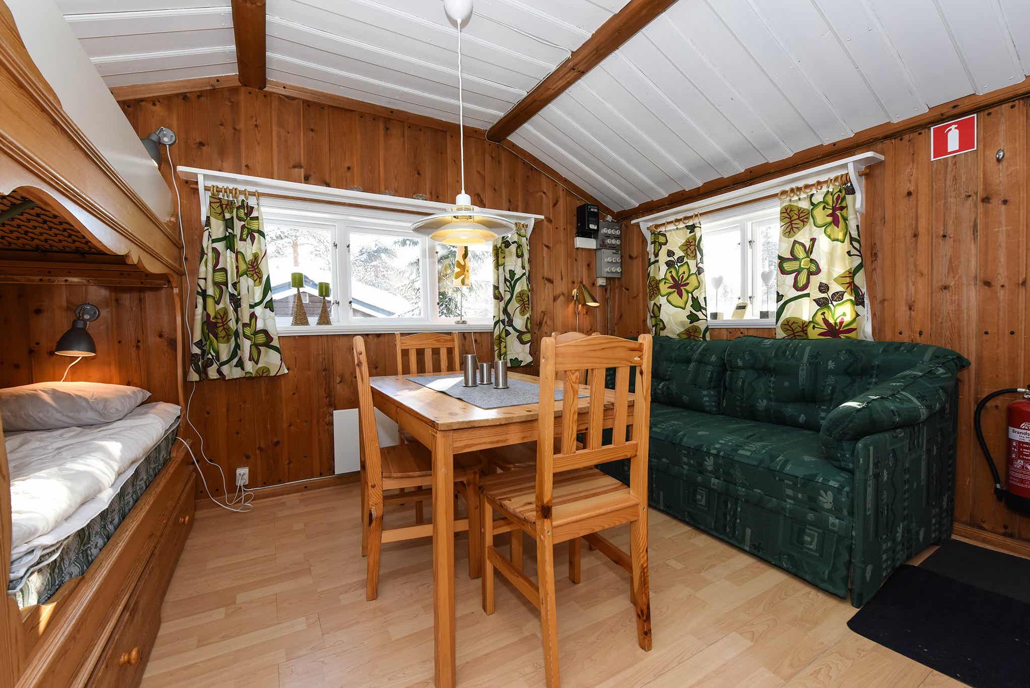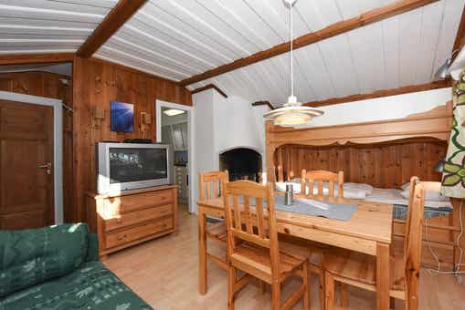 Woonkamer met gecombineerde keuken, 1 stapelbed, slaapbank voor twee personen.
