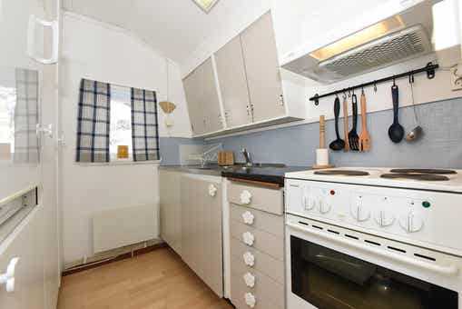 De keuken bevat een fornuis met 3 kookplaten en oven, koelkast, vriesvak, magnetron.