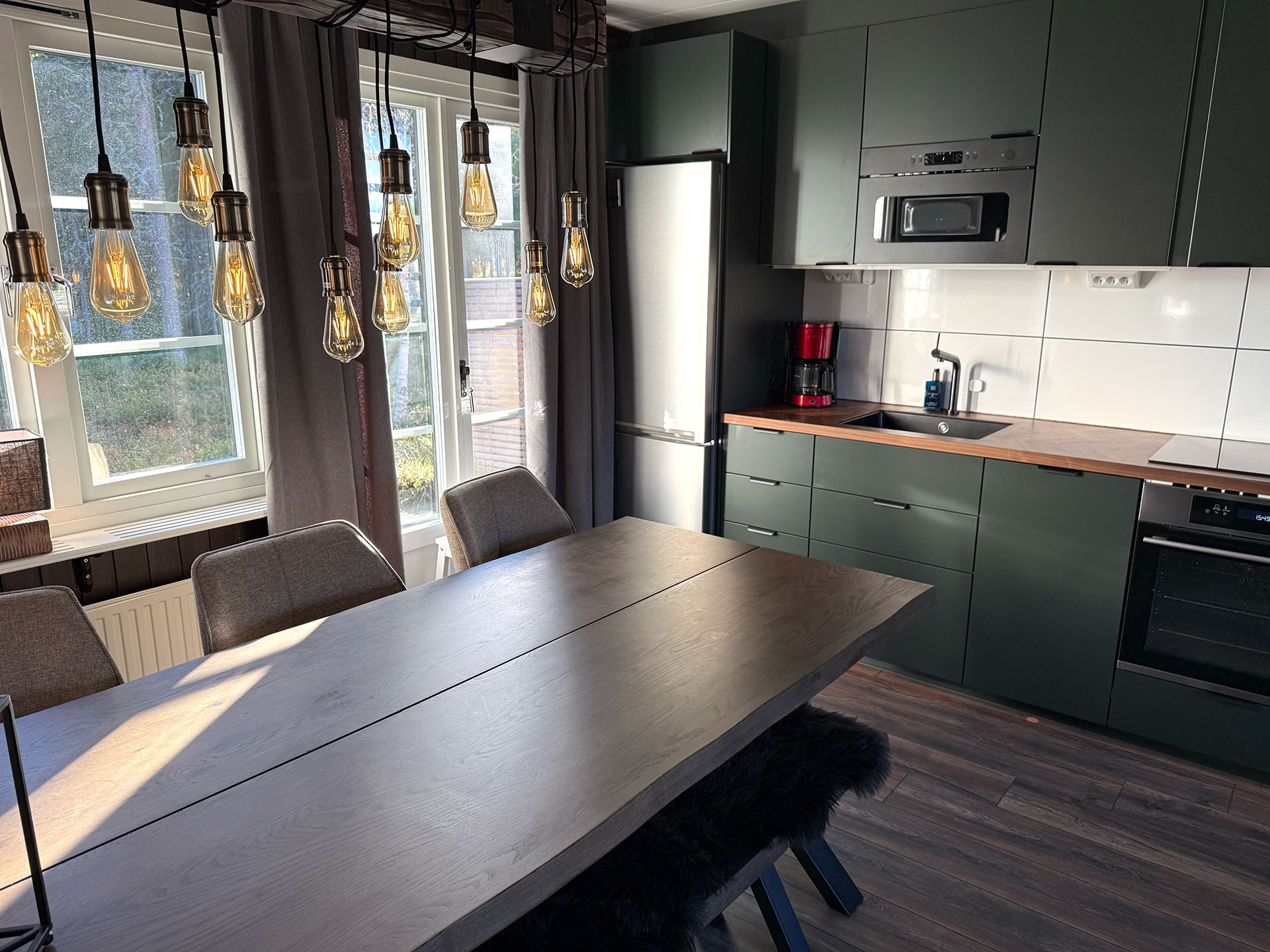 De keuken is voorzien van fornuis met oven, koelkast, vriezer, vaatwasser, magnetron.