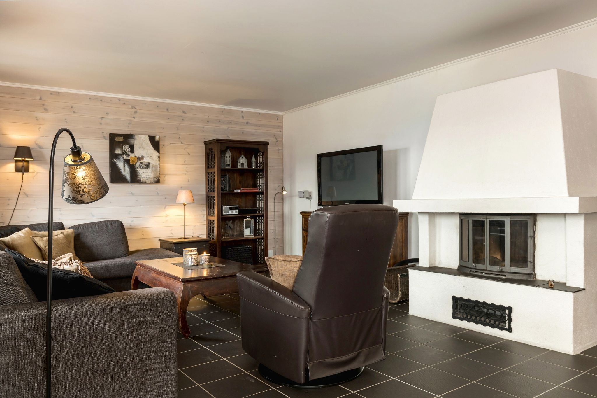 televisie, open haard.