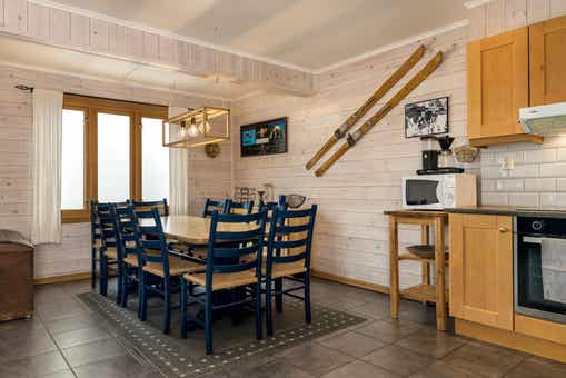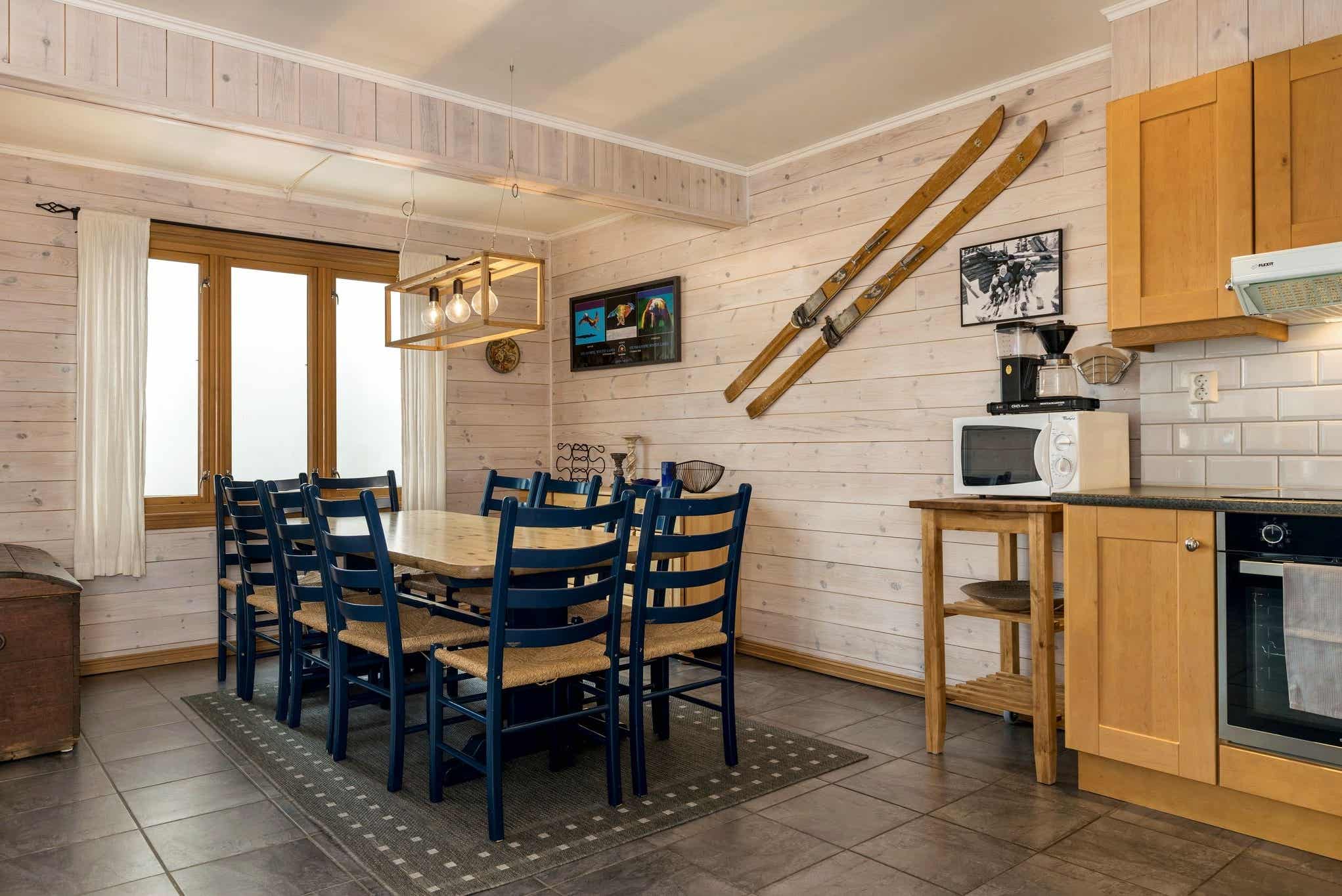 Skarsnuten Fjellandsby bevindt zich in Hemsedal Skisenter. Appartement, 9+1 bedden, 119 m², woonkamer met gecombineerde keuken, 4 slaapkamers, 2 douches, 2 WC, sauna.