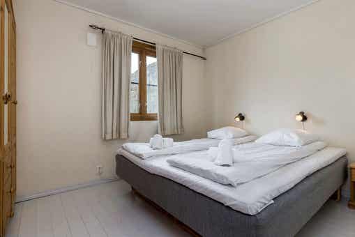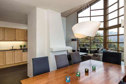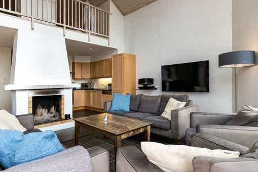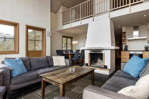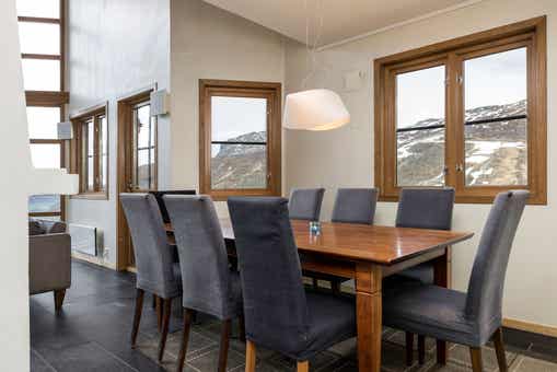 Skarsnuten Fjellandsby bevindt zich in Hemsedal Skisenter. Appartement, 8+1 bedden, 119 m², woonkamer met gecombineerde keuken, 2 slaapkamers, 1 vide, 2 douches, 2 WC, sauna.