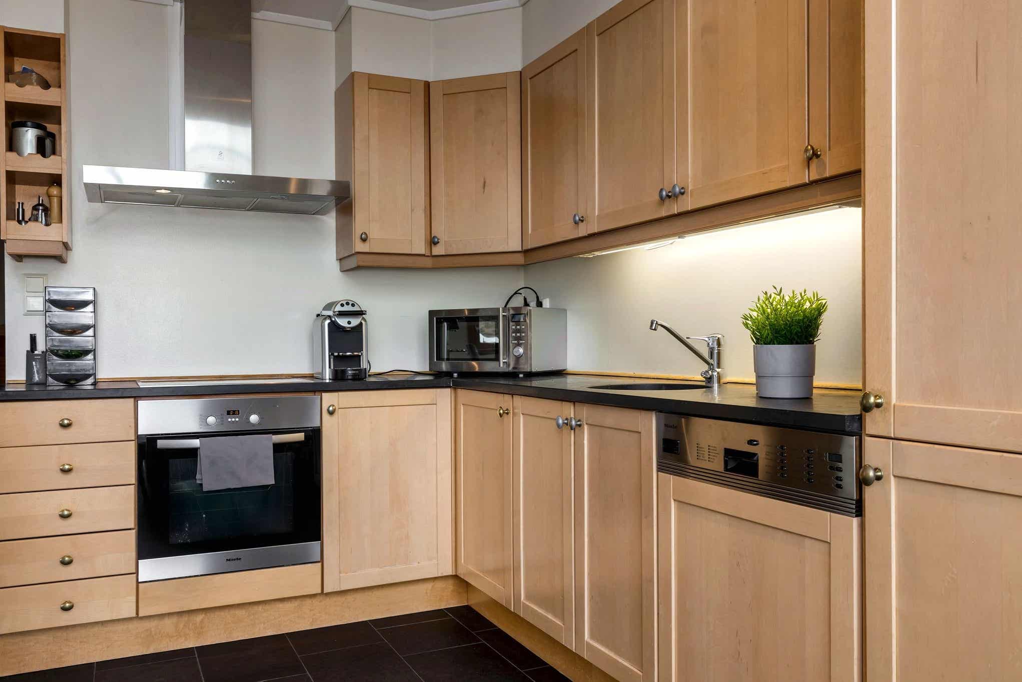 Keuken: fornuis, koelkast met vriesvak, vaatwasser, magnetron.