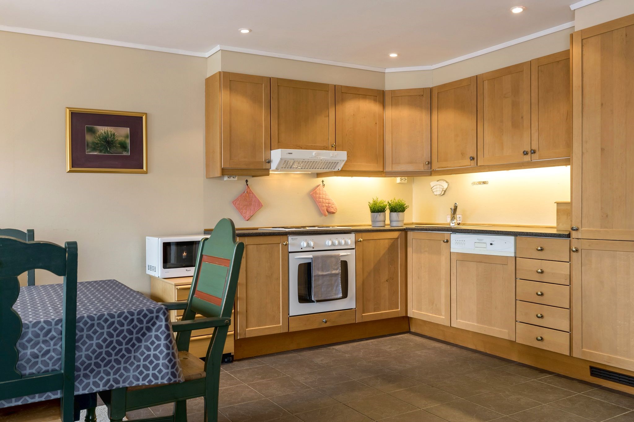 Keuken: fornuis, koelkast met vriesvak, vaatwasser, magnetron.