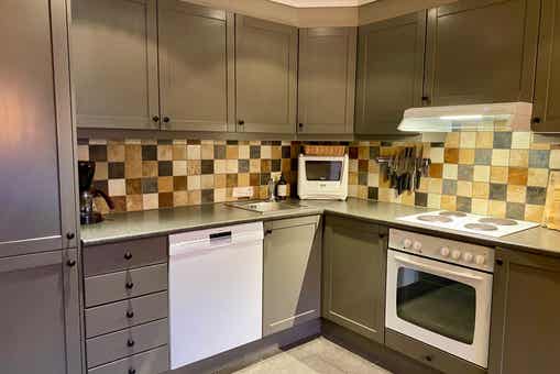 Keuken: fornuis, koelkast met vriesvak, vaatwasser, magnetron.