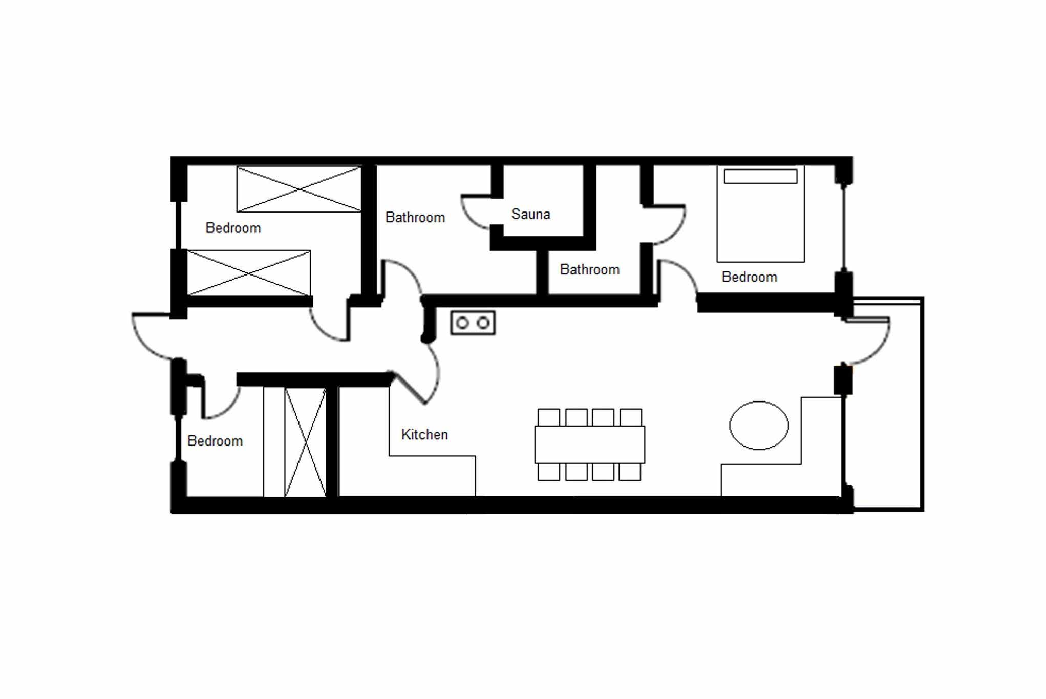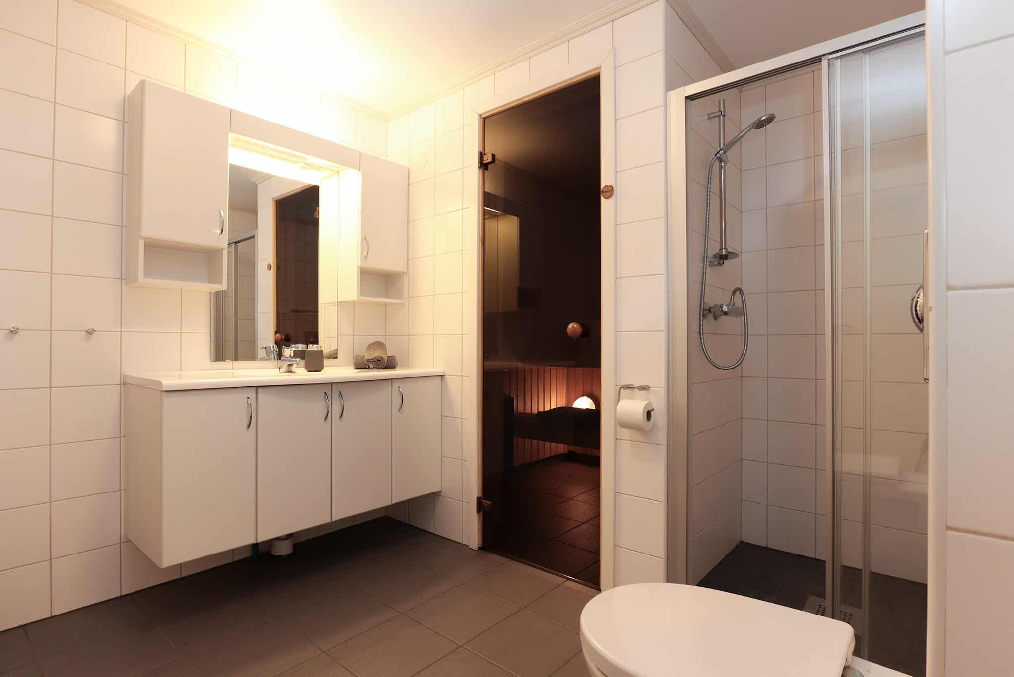 Badkamers:Badkamer 1: sauna, douche, toilet. Badkamer 2: douche, toilet.
