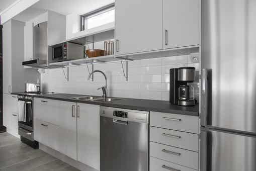 De keuken is voorzien van fornuis met oven, koelkast, vriezer, vaatwasser, magnetron.