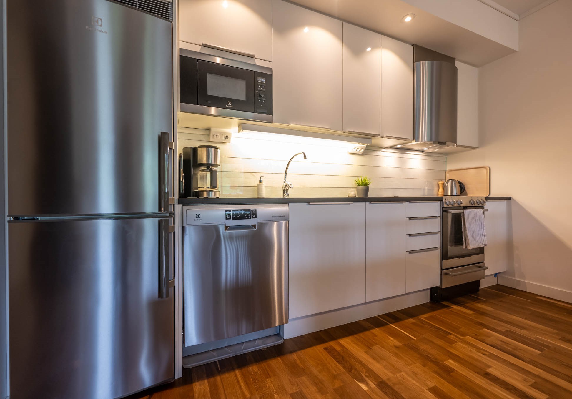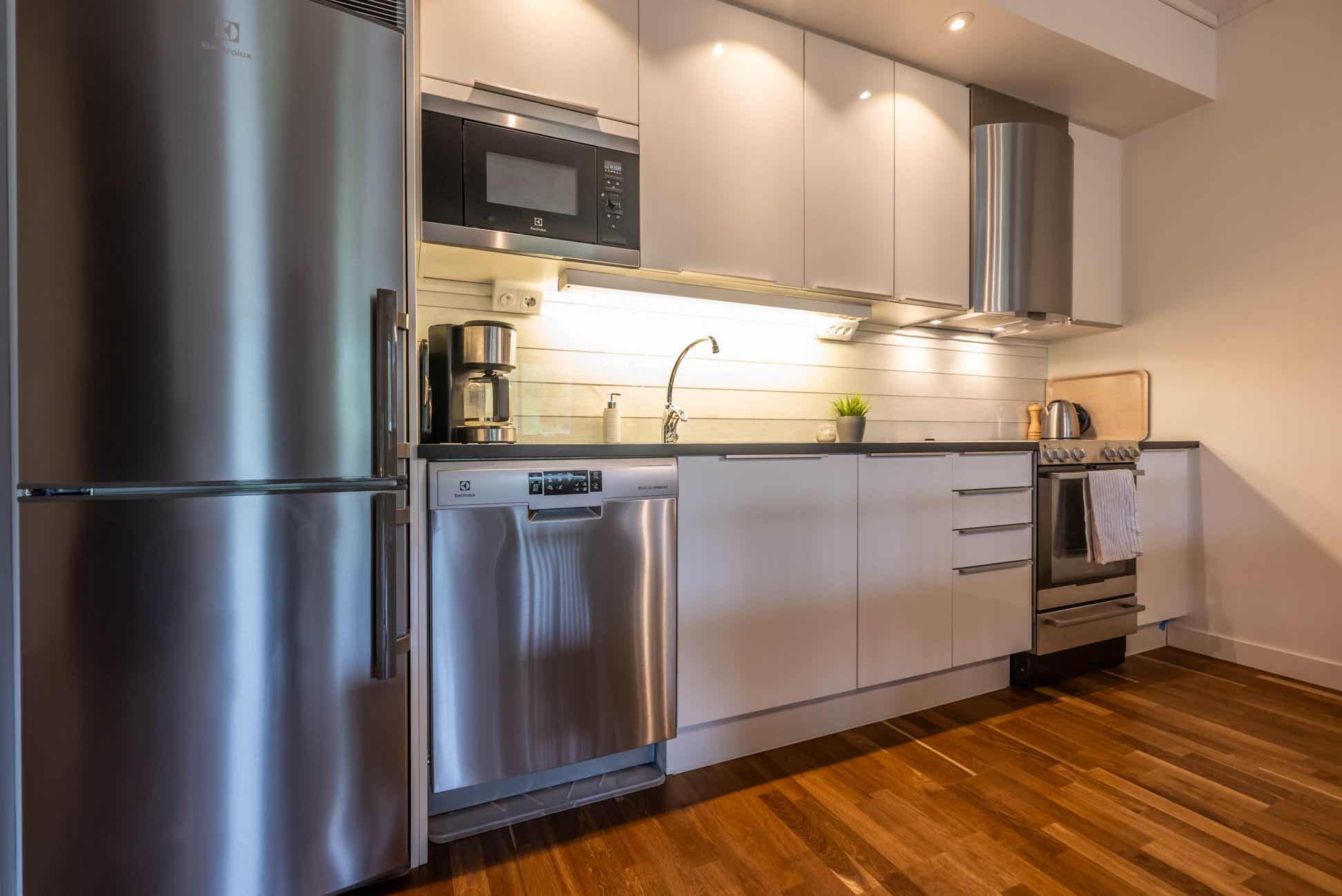 De keuken is voorzien van elektrische kookplaat, oven, magnetron, koelkast, vriezer, vaatwasser.