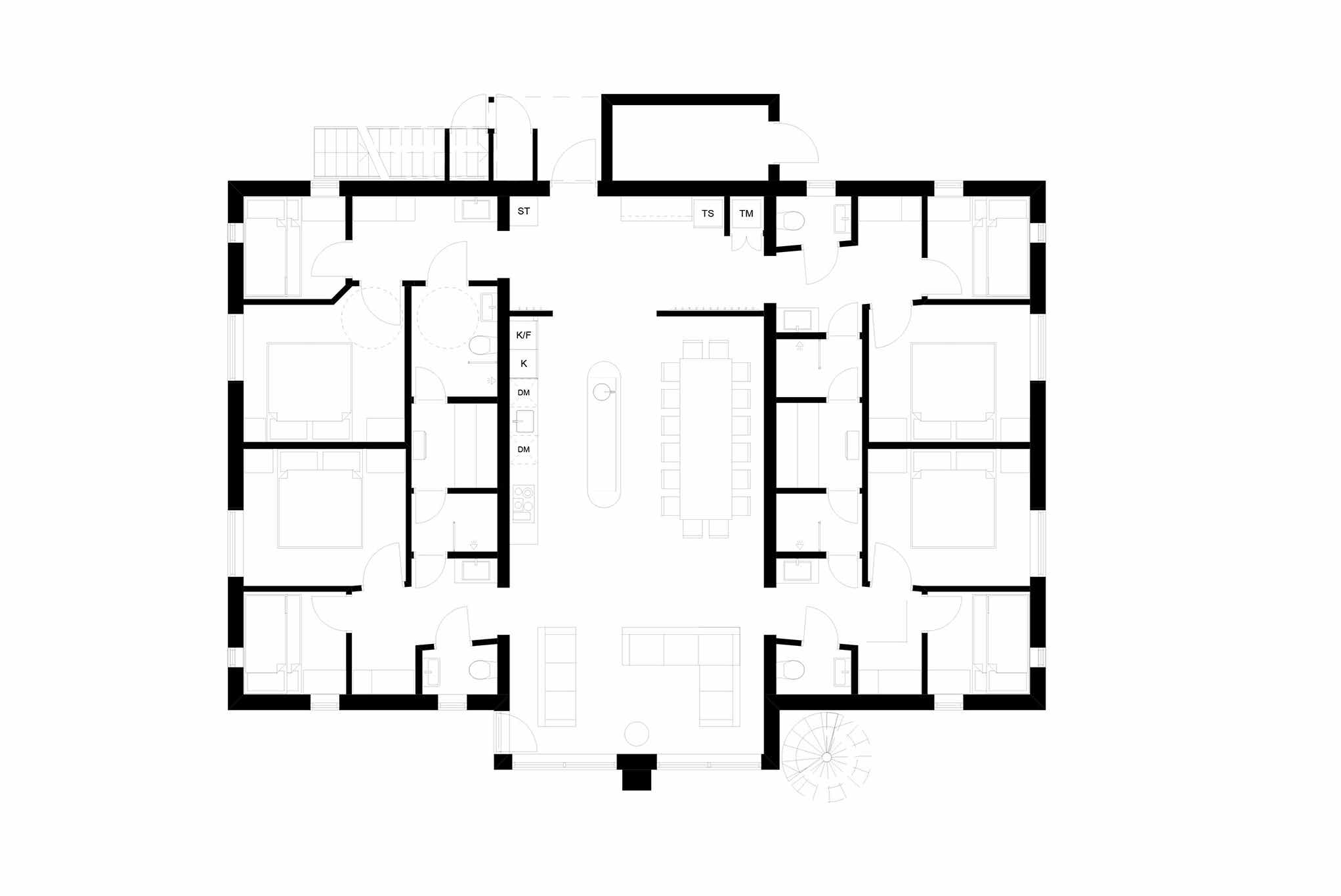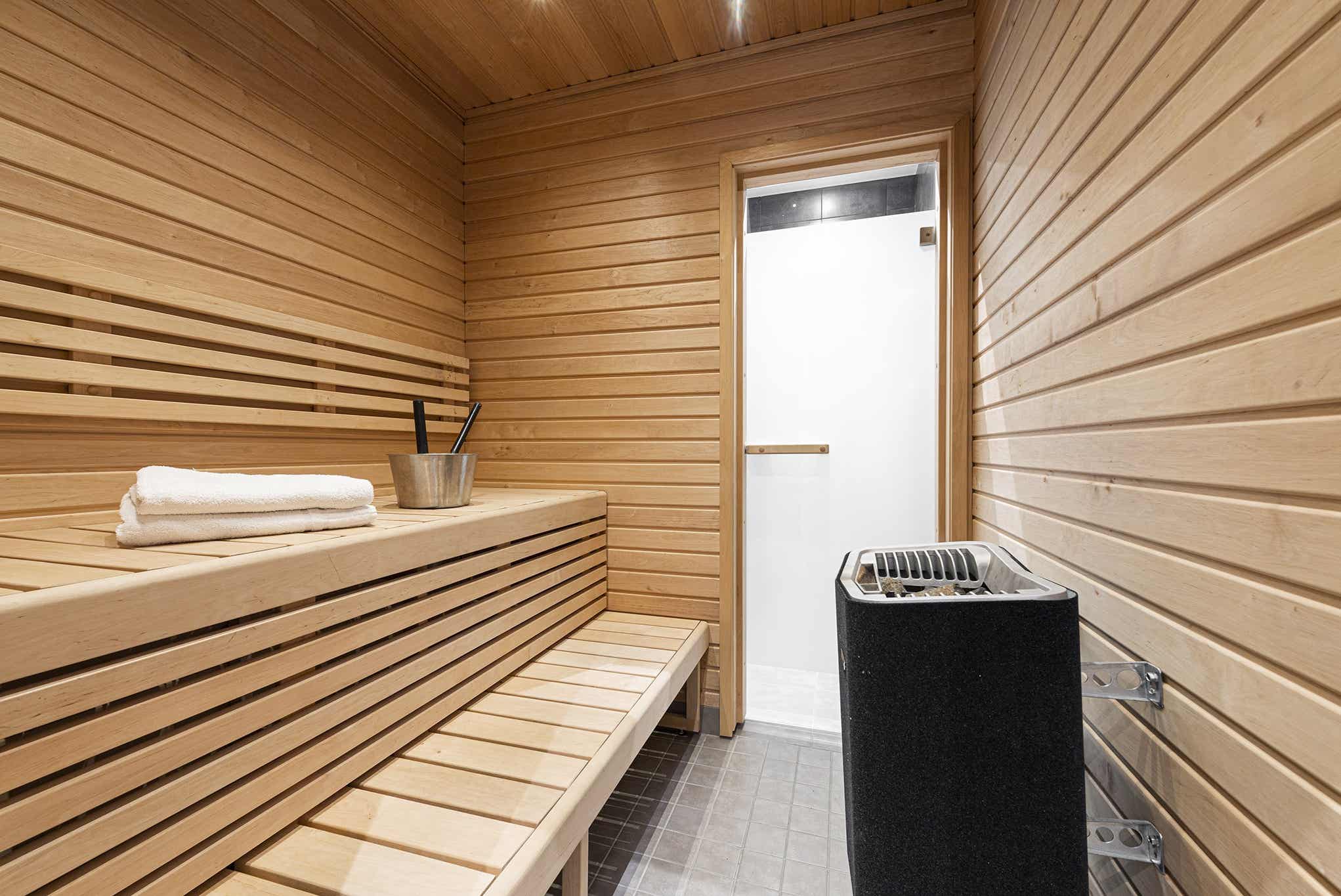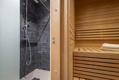 Badkamers:Badkamer 1: met 2 douches, WC, sauna, toegankelijk voor gehandicapten. Badkamer 2: met toilet. Badkamer 3: met toilet. Badkamer 4: met 2 douches, sauna. Badkamer 5: met toilet.