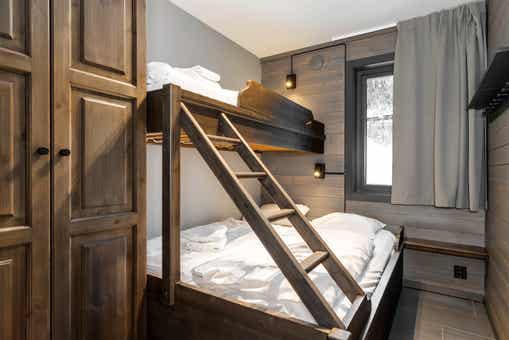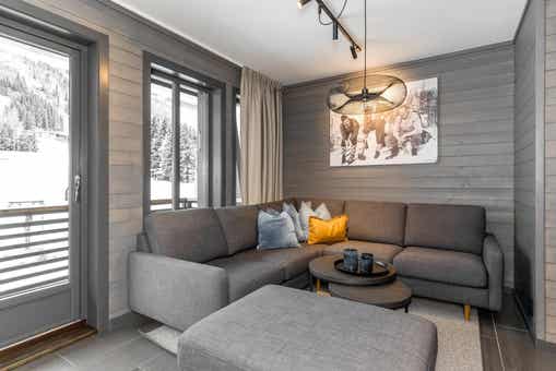 Appartement op verdieping 3, Lodge Alpin, 8 bedden, 67 m², woonkamer met gecombineerde keuken, 3 slaapkamers, 2 douches, 2 toiletten, 1 sauna.