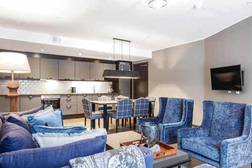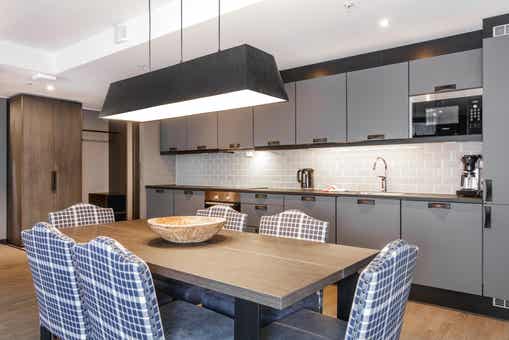 Appartement op verdieping 2, Lodge Suites, 6 bedden, 70 m², woonkamer met gecombineerde keuken, 2 slaapkamers, 1 douche, 1 toilet.
