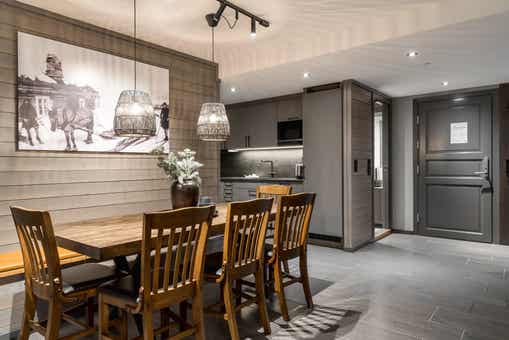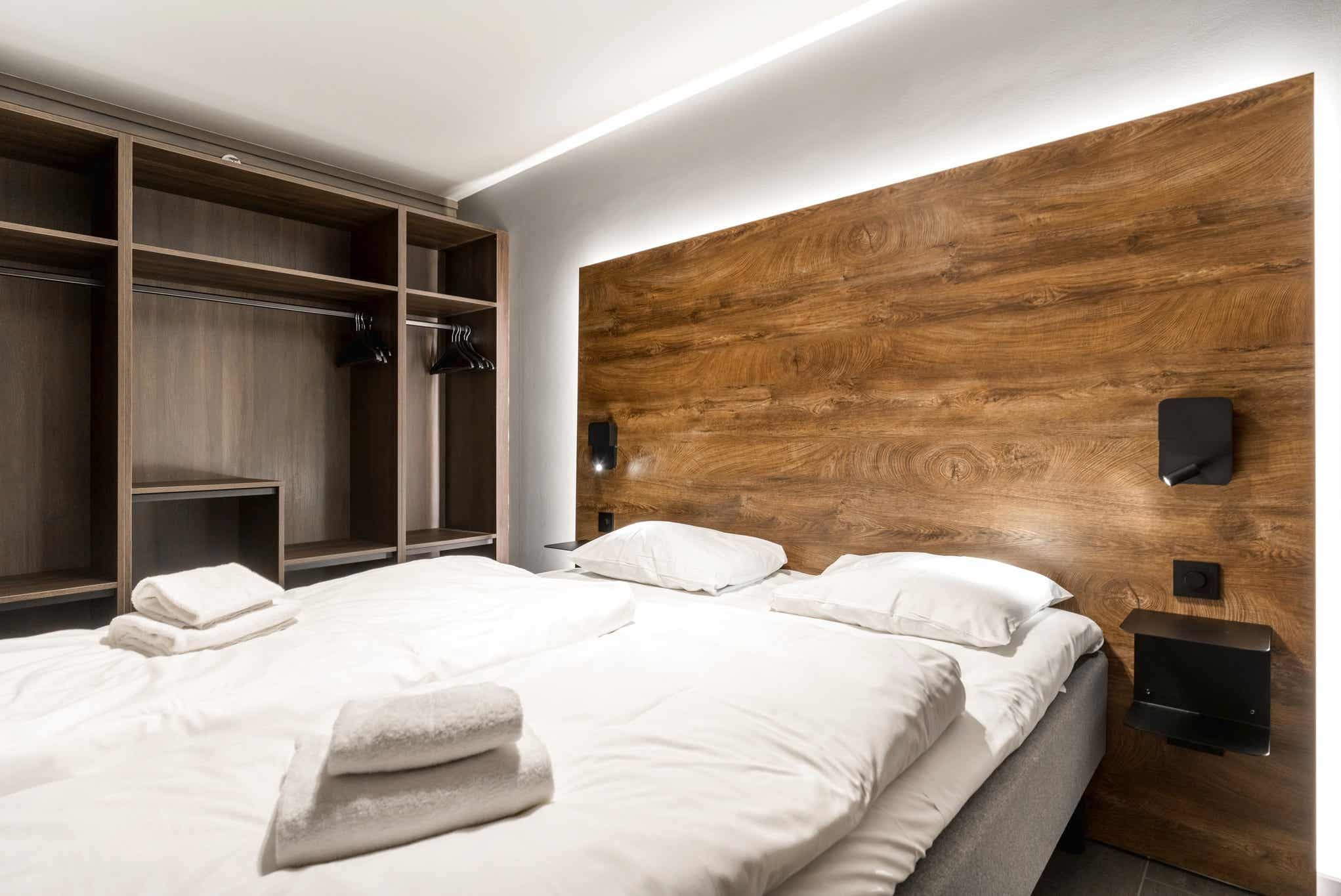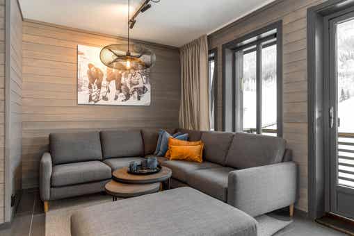 Appartement op verdieping 3, Lodge Alpin, 8 bedden, 67 m², woonkamer met gecombineerde keuken, 3 slaapkamers, 2 douches, 2 toiletten, 1 sauna.