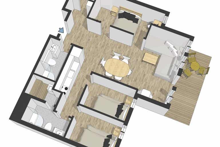 Appartement op verdieping 3, Lodge Alpin, 8 bedden, 67 m², woonkamer met gecombineerde keuken, 3 slaapkamers, 2 douches, 2 toiletten, 1 sauna.