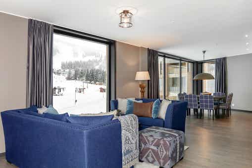Appartement op verdieping 3, Lodge Suites, 8 bedden, 90 m², woonkamer met gecombineerde keuken, 3 slaapkamers, 2 douches, 2 toiletten.