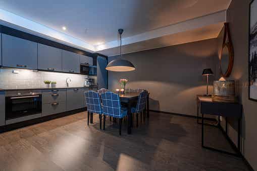 Appartement op verdieping 4, Lodge Suites, 6 bedden, 65 m², woonkamer met gecombineerde keuken, 2 slaapkamers, 1 douche, 1 toilet.