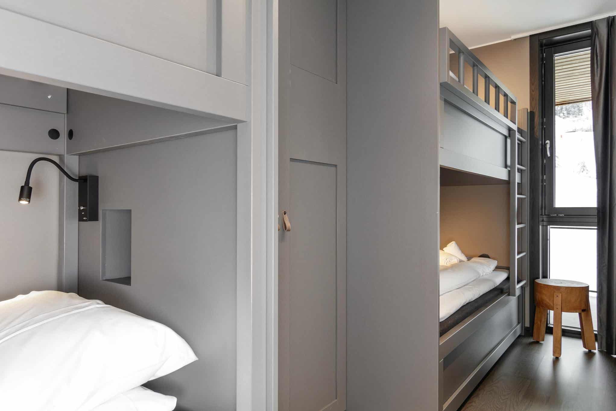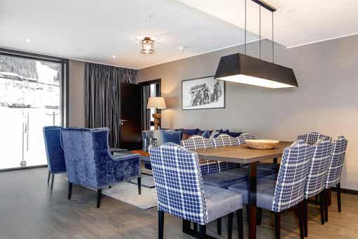 Appartement op verdieping 4, Lodge Suites, 8 bedden, 80 m², woonkamer met gecombineerde keuken, 3 slaapkamers, 1 douche, 2 WC.