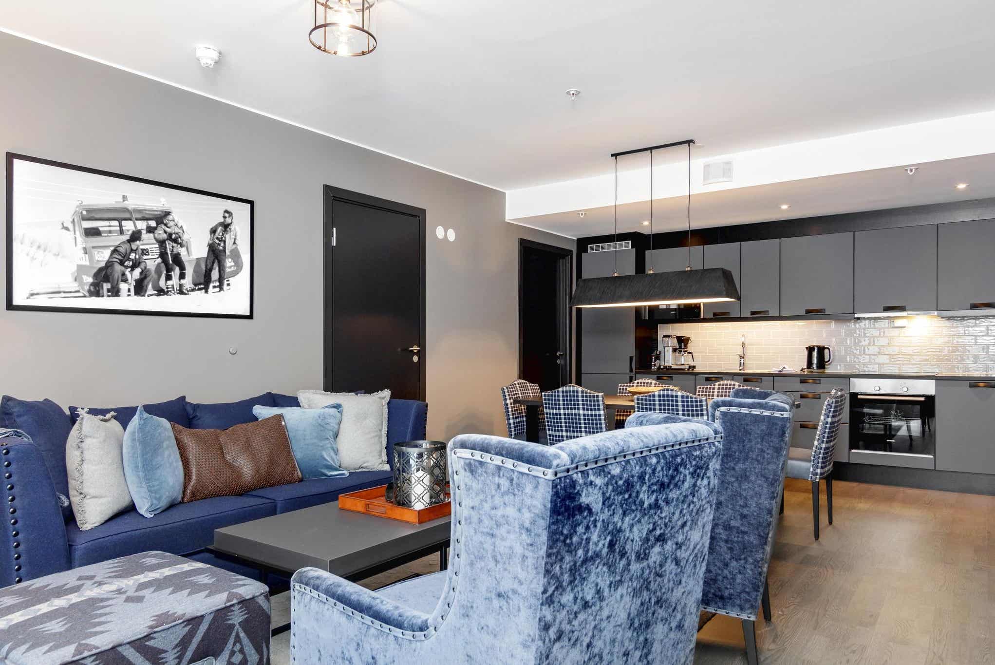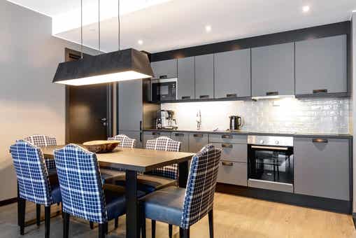 Appartement op verdieping 4, Lodge Suites, 6 bedden, 75 m², woonkamer met gecombineerde keuken, 3 slaapkamers, 2 douches, 2 toiletten.