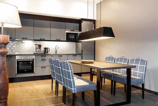 Appartement op verdieping 4, Lodge Suites, 6 bedden, 65 m², woonkamer met gecombineerde keuken, 2 slaapkamers, 1 douche, 1 toilet.