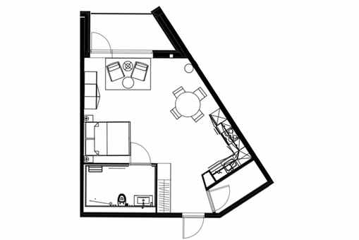 Appartement op verdieping 2, Lodge Suites, 2 bedden, 43 m², woonkamer met gecombineerde keuken, 1 douche, 1 toilet.