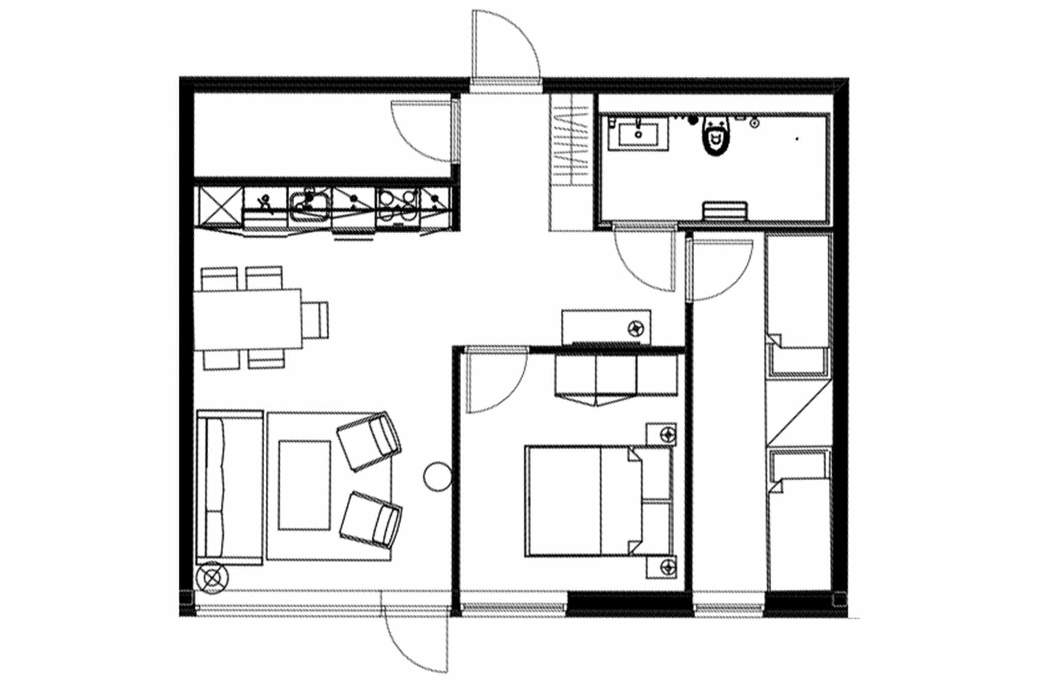 Appartement op verdieping 1, Valle Suites, Lodge Suites, 6 bedden, 60 m², woonkamer met gecombineerde keuken, 2 slaapkamers, 1 douche, 1 toilet.
