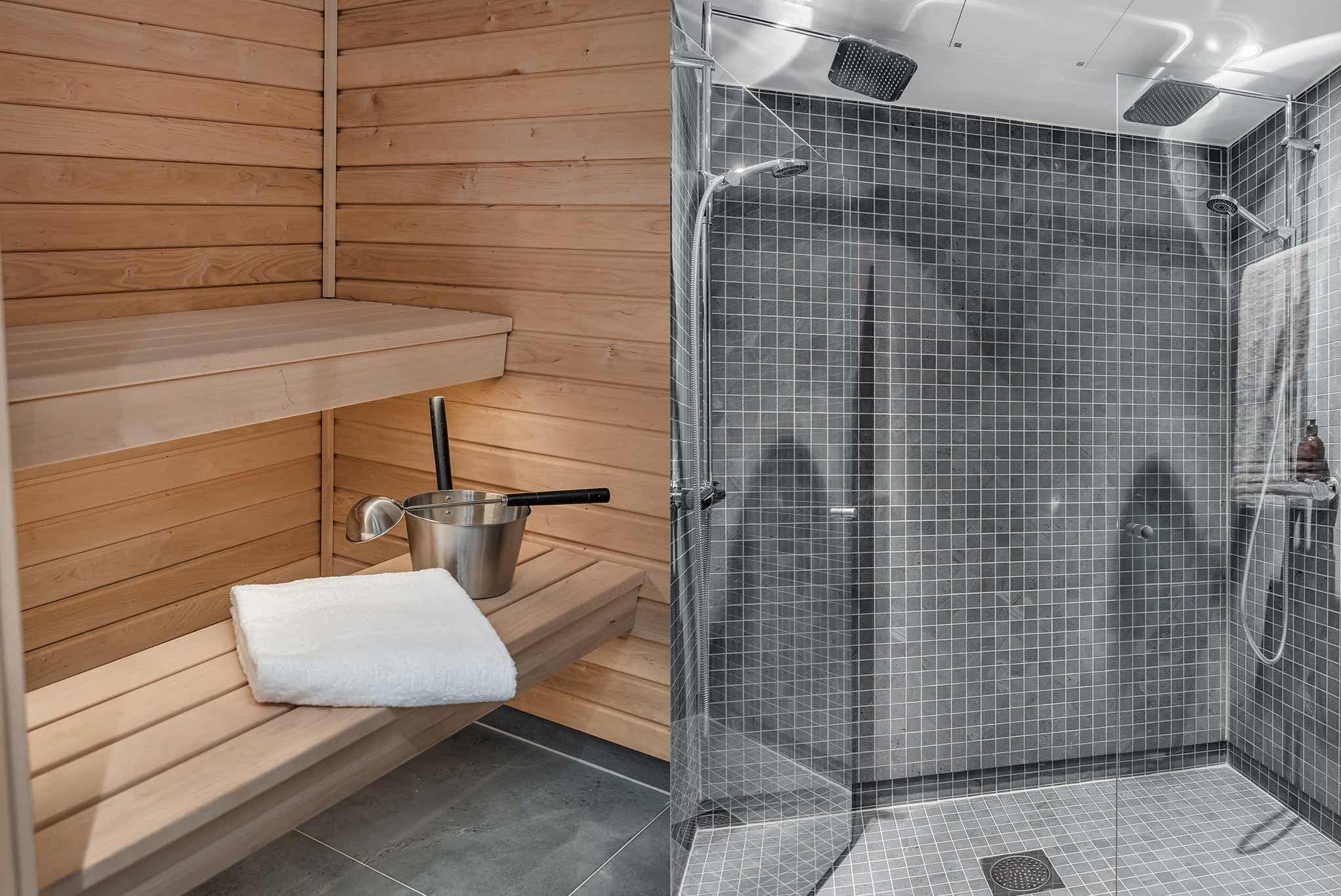 Badkamers:Badkamer 1: met dubbele douche, toilet, sauna. Badkamer 2: met toilet.