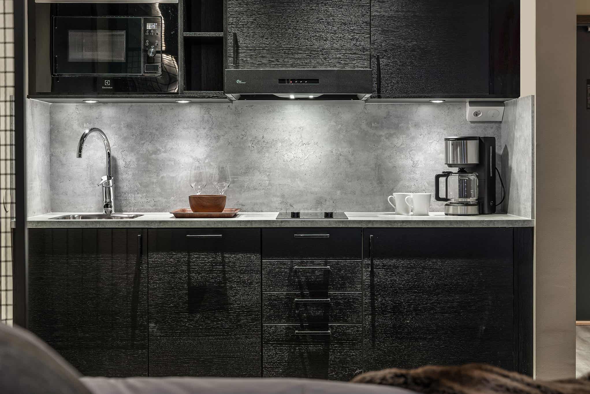 De keuken is voorzien van een elektrische kookplaat met twee kookplaten, koelkast met vriesvak, magnetron, vaatwasser.