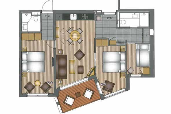 Appartement op de eerste verdieping, Lodge C, 6 bedden, 70 m², 3 slaapkamers, 2 douches, 2 toiletten.