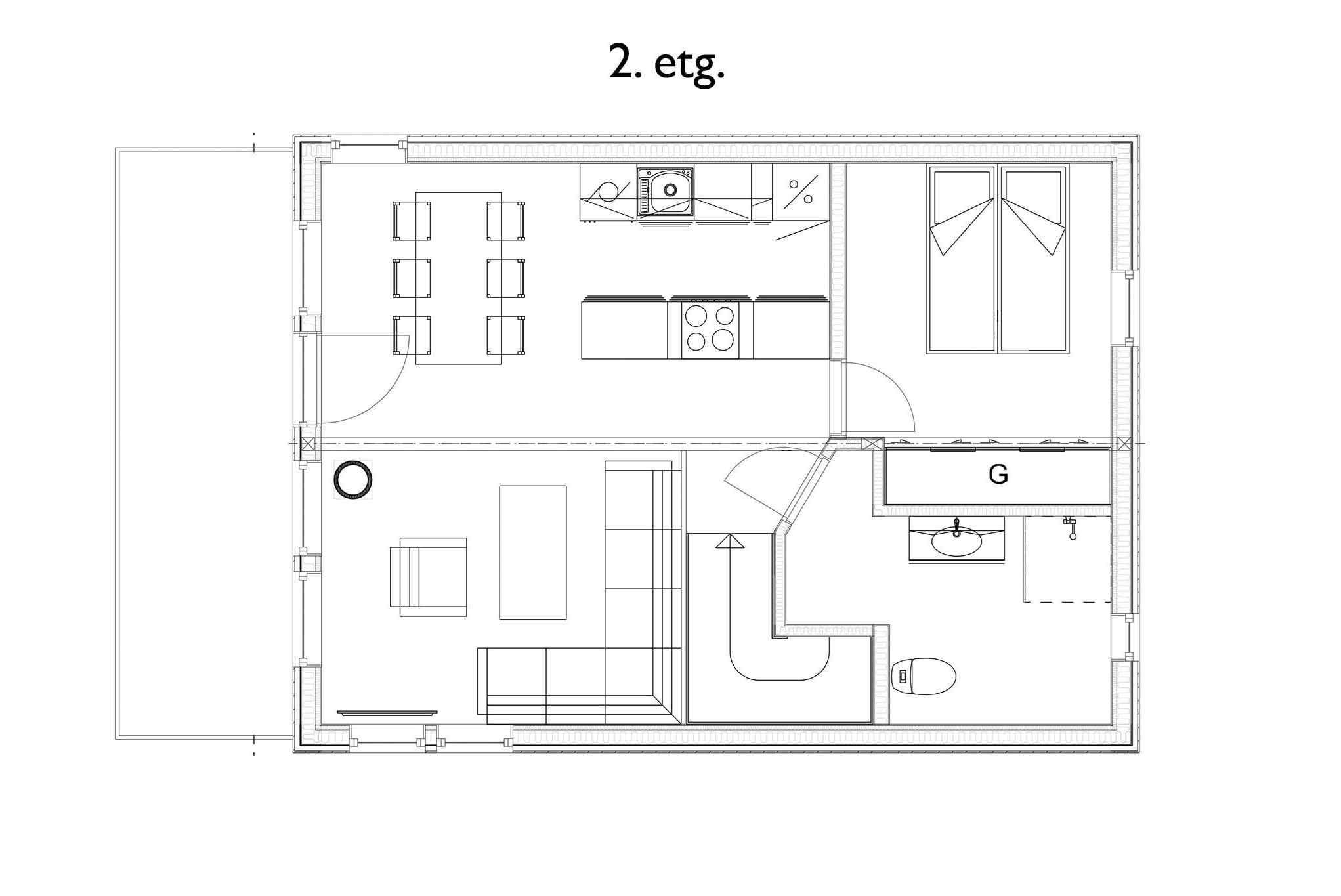 Vrijstaand huisje op twee verdiepingen, 8 bedden, 109 m², woonkamer met gecombineerde keuken, 4 slaapkamers, 2 douches, 2 toiletten.