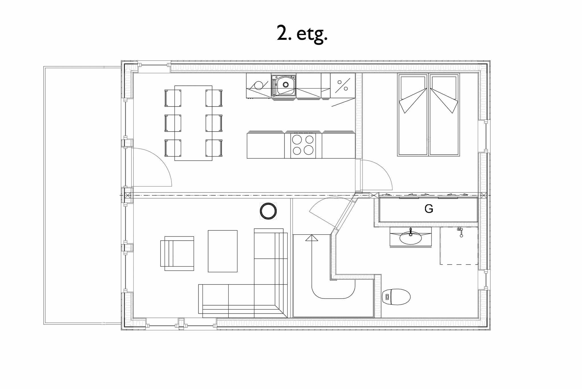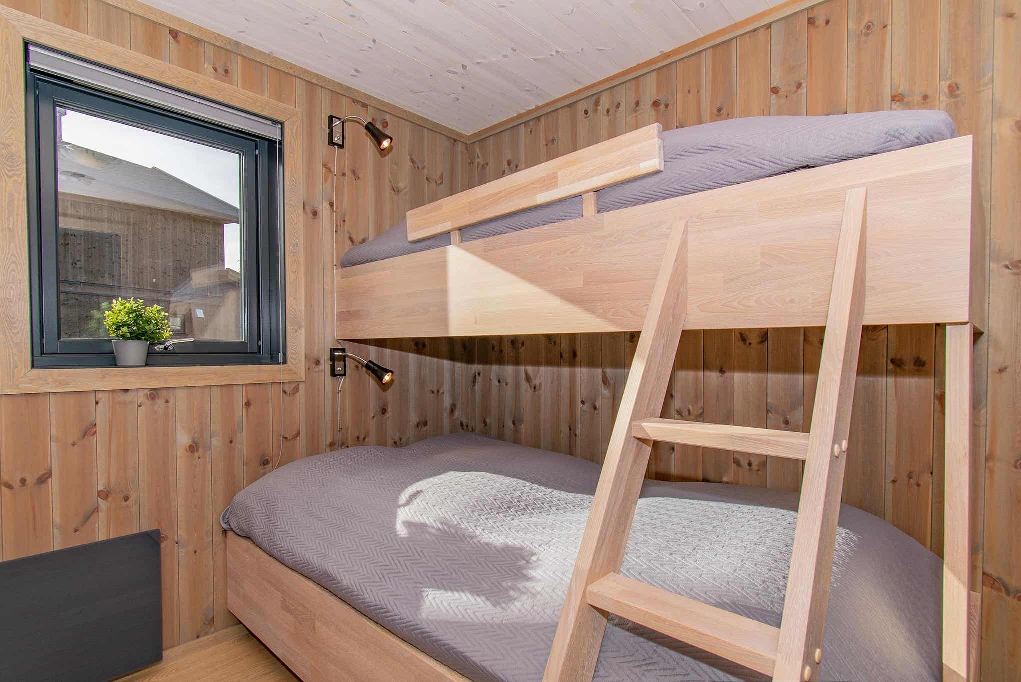 Vrijstaand huisje op twee verdiepingen, 8 bedden, 109 m², woonkamer met gecombineerde keuken, 4 slaapkamers, 2 douches, 2 toiletten, 1 sauna.