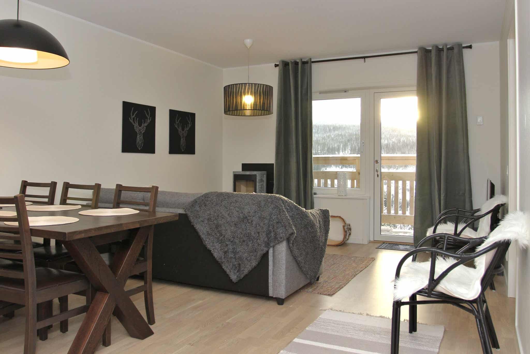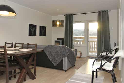 TV, houtkachel (hout is niet inbegrepen), wasmachine, droogkast, balkon (niet geruimd), afsluitbare skiberging, 1 parkeerplaats met stroom voor motorvoorverwarmer.
