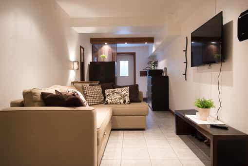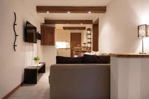 Woonkamer met gecombineerde keuken, slaapbank voor 1 persoon.
