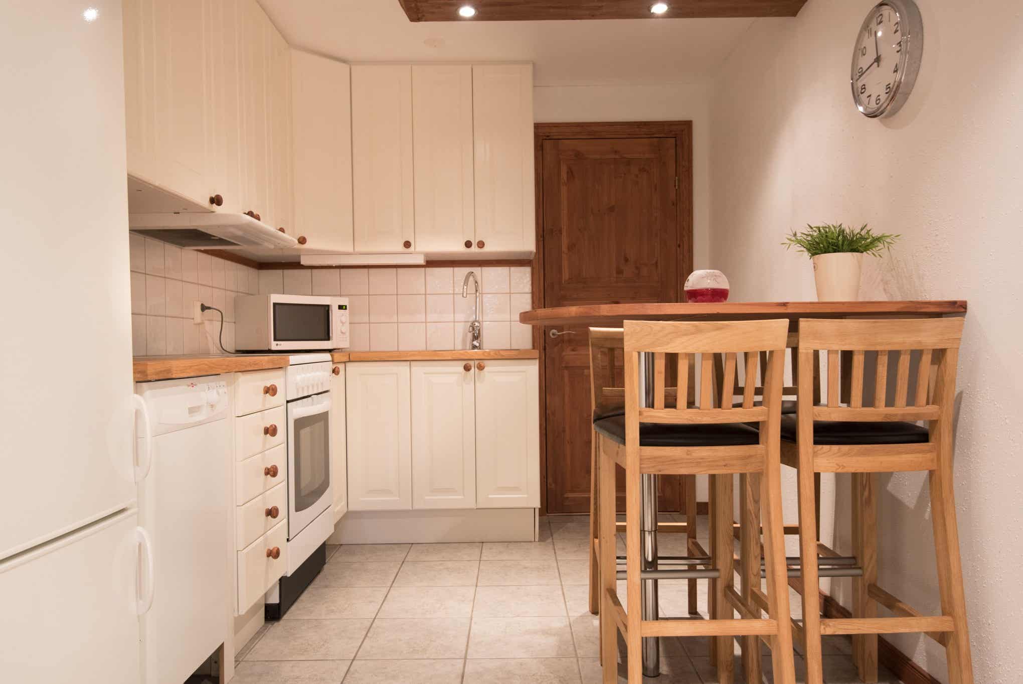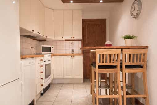 De keuken is voorzien van elektrische kookplaat met oven, koelkast, vriezer, vaatwasser, magnetron.