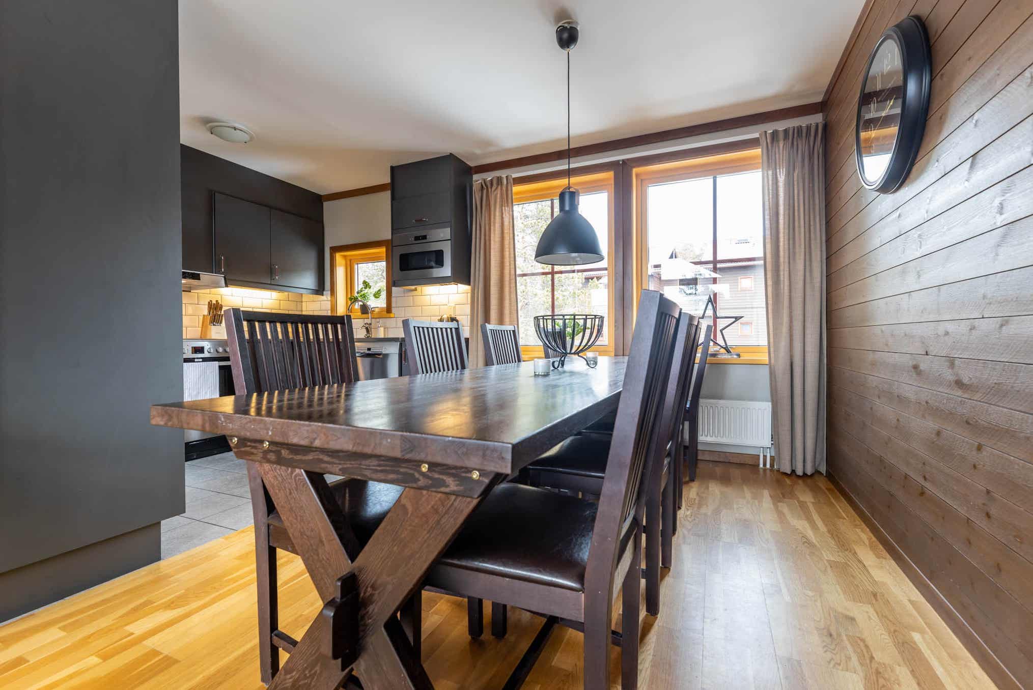 Solbacken ligt in Tandådalen. Appartement op de tweede verdieping, 8 bedden, 81 m², woonkamer met gecombineerde keuken, 4 slaapkamers, 2 douches, 2 WC, sauna.