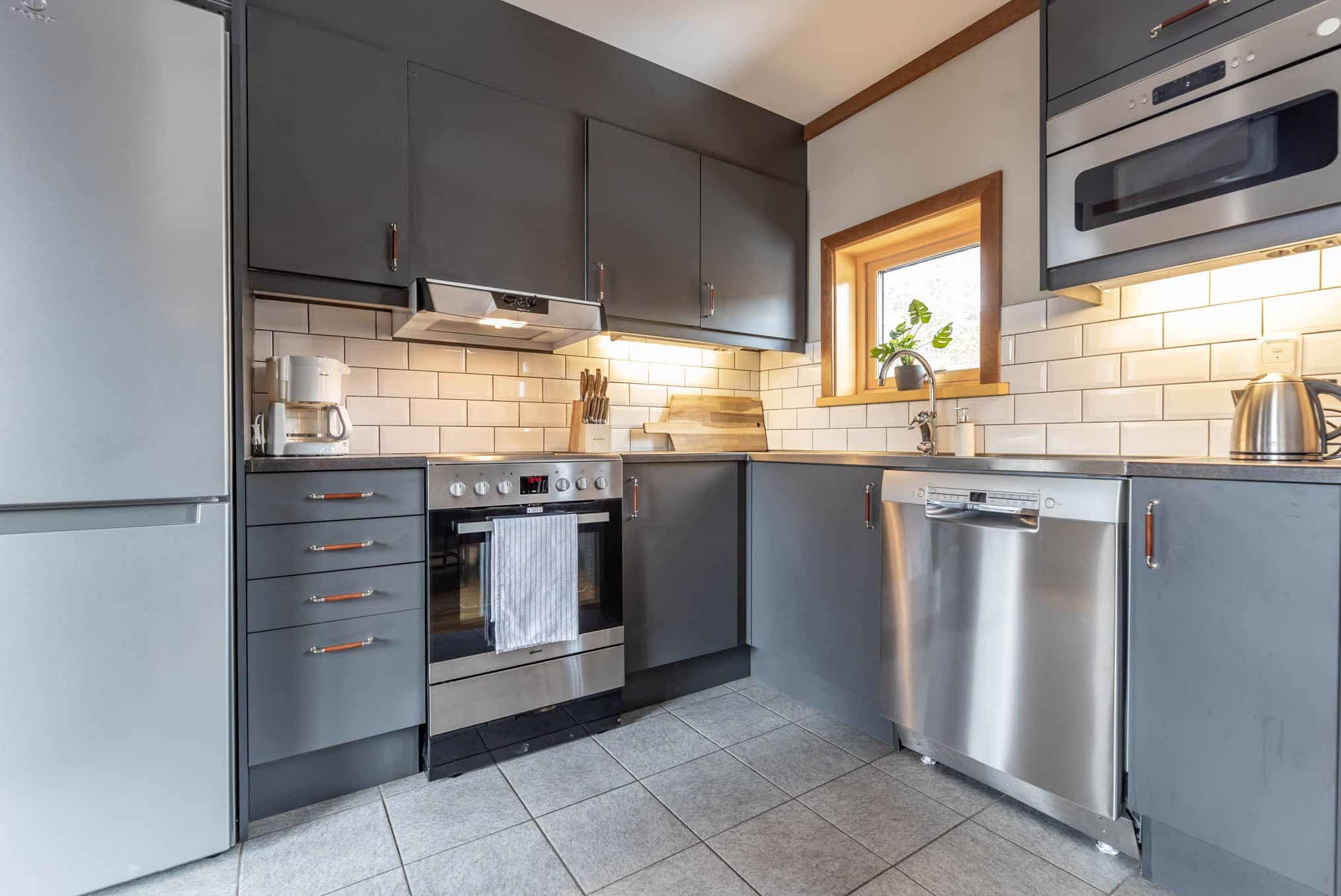 De keuken is voorzien van fornuis met oven, koelkast, vriezer, vaatwasser, magnetron.