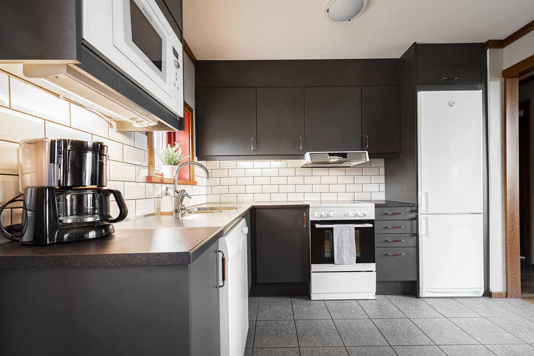 De keuken is voorzien van fornuis met oven, koelkast, vriezer, vaatwasser, magnetron.
