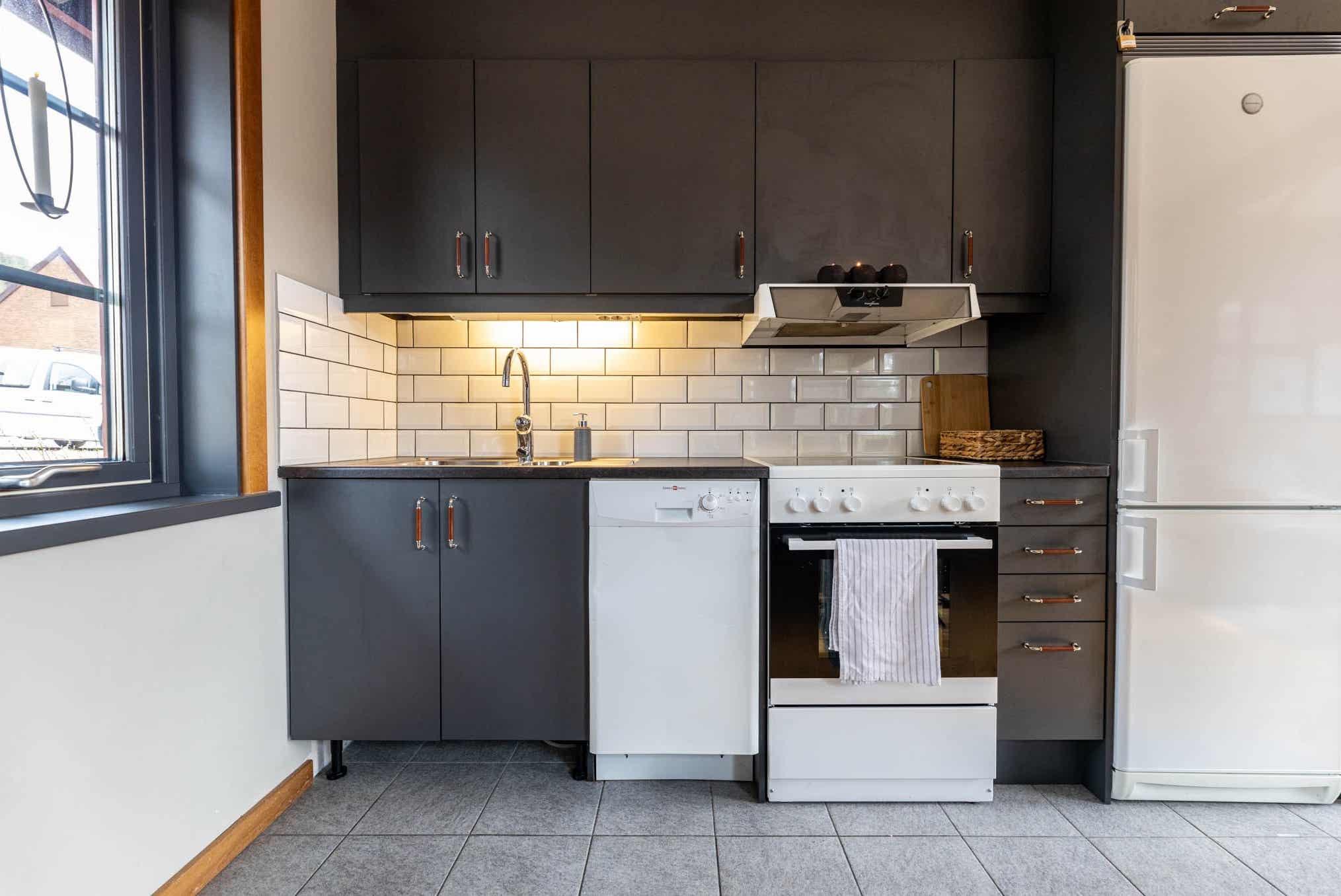 De keuken is voorzien van fornuis met oven, koelkast, vriezer, vaatwasser, magnetron.