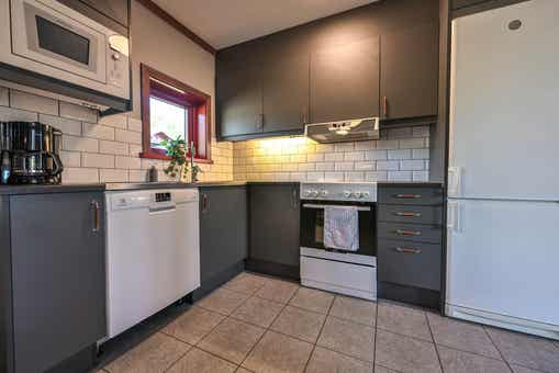 De keuken is voorzien van fornuis met oven, koelkast, vriezer, vaatwasser, magnetron.