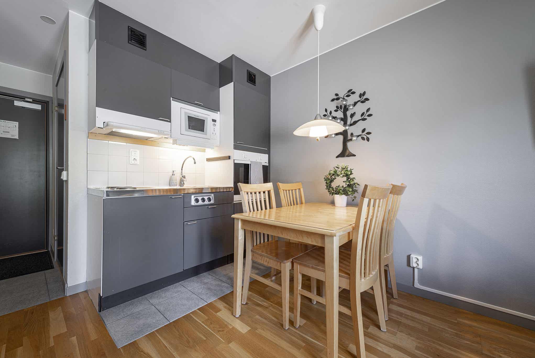 De keuken bevat een kitchenette met ingebouwde oven, koelkast, vriezer, vaatwasser, magnetron.