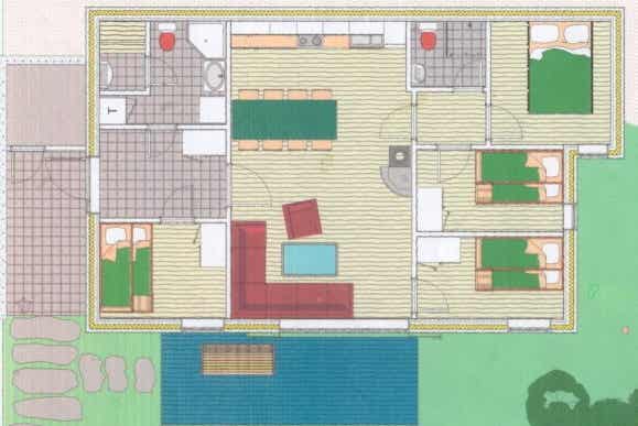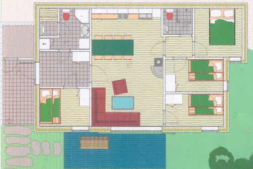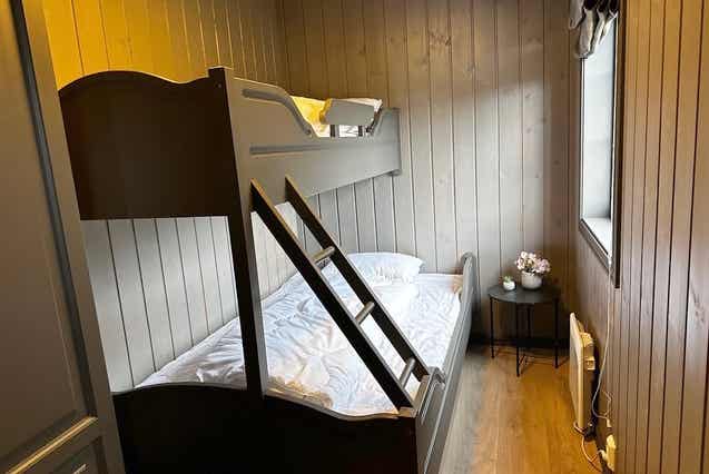Slaapkamers:Slaapkamer 1= 1 stapelbed met 150 cm breed onderbed en 75 cm breed bovenbed. Slaapkamer 2= 1 stapelbed met 120 cm breed onderbed. Slaapkamer 3= 1 stapelbed met 120 cm breed onderbed. Slaapkamer 4= 1 tweepersoonsbed 180 cm breed.