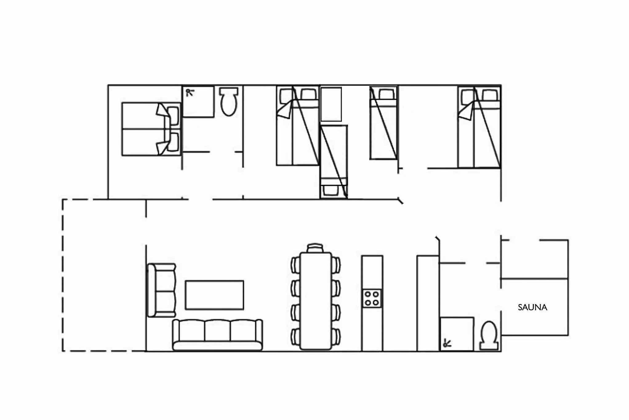 Appartement op de eerste verdieping, 9 bedden, 81 m², woonkamer met gecombineerde keuken, 4 slaapkamers, 2 douches, 2 toiletten, 1 sauna.