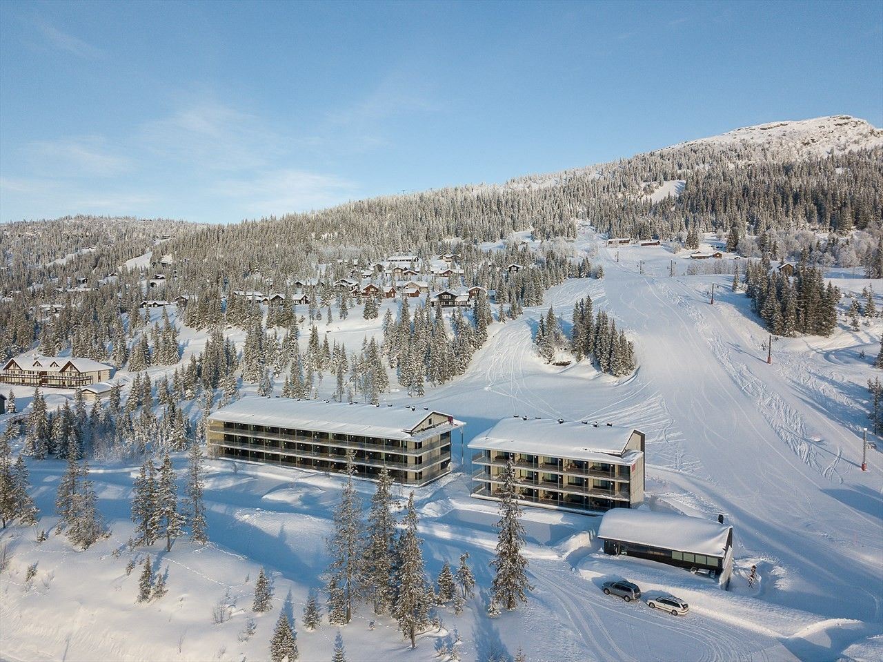 Geen druk centrum, maar wel knusse cabins, haardvuren en ski-in/ski-out lodges met uitzicht. Gezinnen vinden overzichtelijke kinderzones en een funslope, terwijl de rustige sfeer zorgt voor ontspannen vakantiedagen in de sneeuw.
