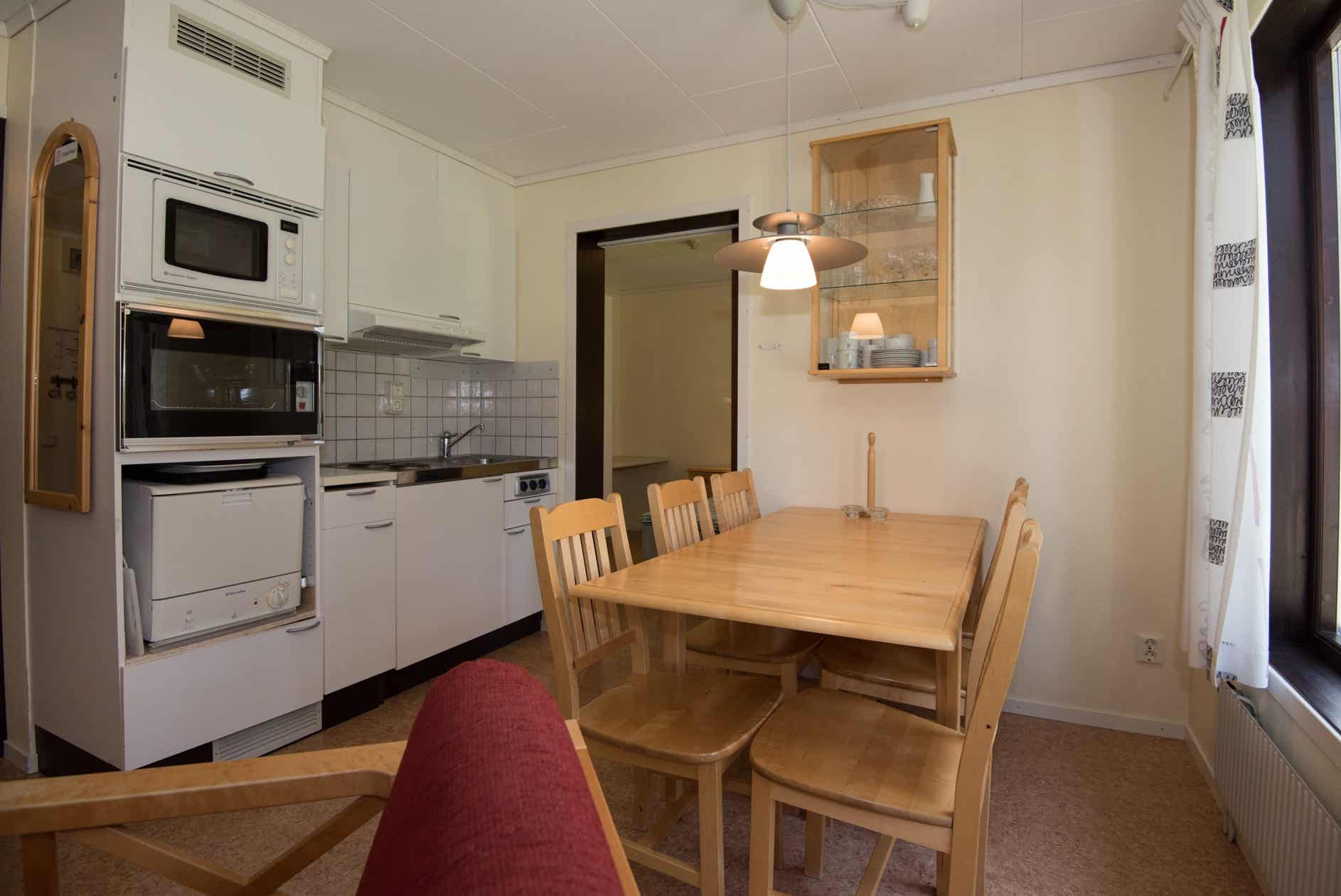 De keuken bevat een kitchenette met 2 kookplaten, bankoven, koelkast, kleine vaatwasser, magnetron.