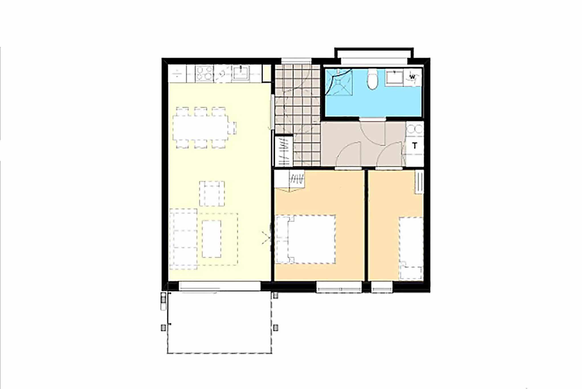 Appartement op de tweede verdieping, 4 bedden, 60 m², woonkamer met gecombineerde keuken, 2 slaapkamers, 1 douche, 1 toilet.