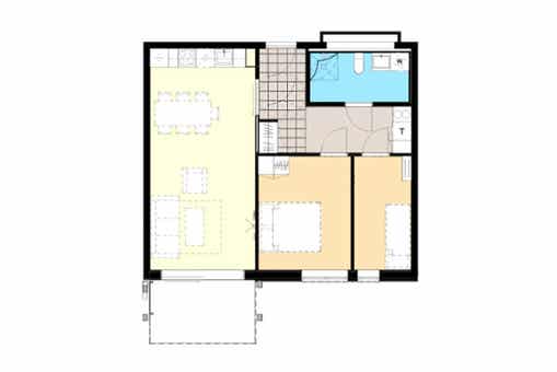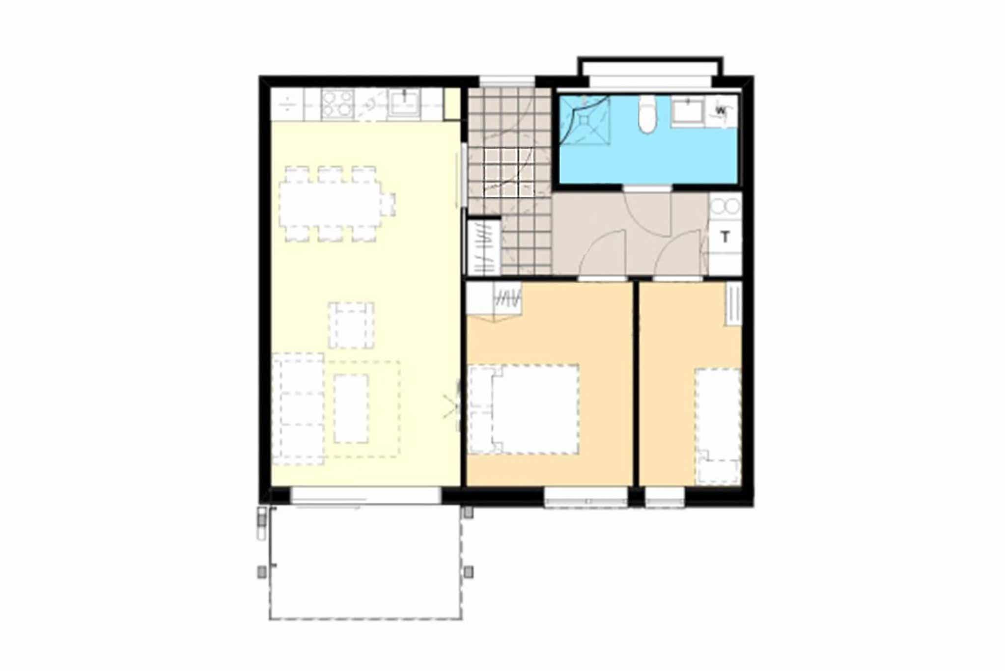 Appartement op de tweede verdieping, 4 bedden, 60 m², woonkamer met gecombineerde keuken, 2 slaapkamers, 1 douche, 1 toilet.